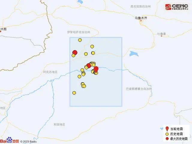 根据中国地震台网速报目录,震中周边200公里内近5年来发生3级以上地震共430次,最大地震分别是2024年4月10日在新疆阿克苏地区拜城县发生的5.6级地震(距离本次震中180公里)和2020年1月16日在新疆阿克苏地区库车县发生的5.6级地震(距离本次震中58公里),按震级大小前50次历史地震分布如图。