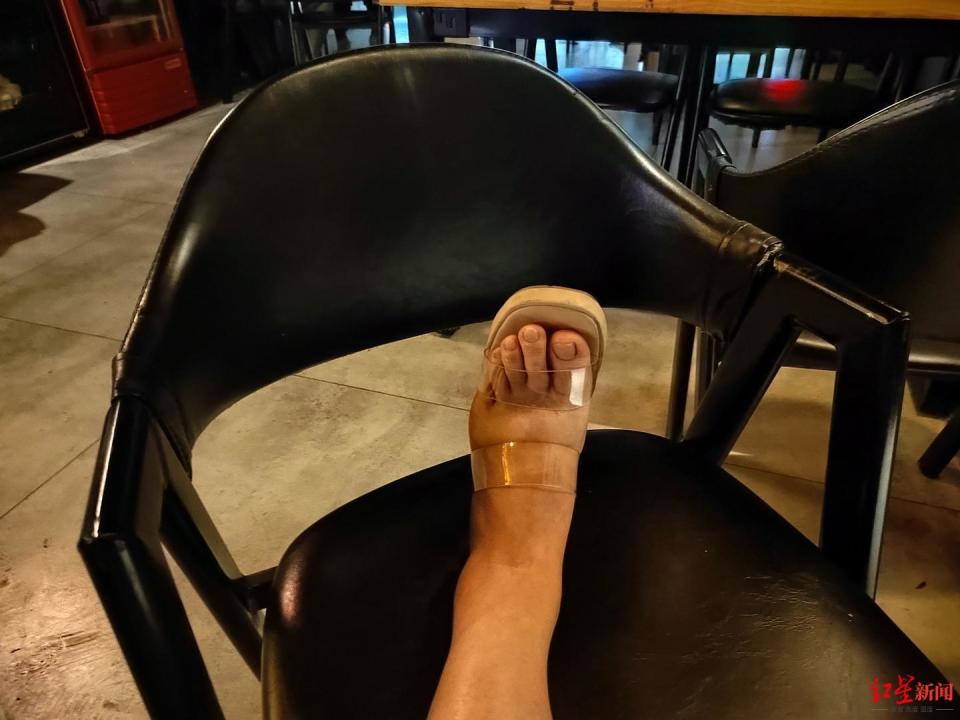 ▲蒋女士穿着高跟鞋在酒吧崴脚后脚肿了