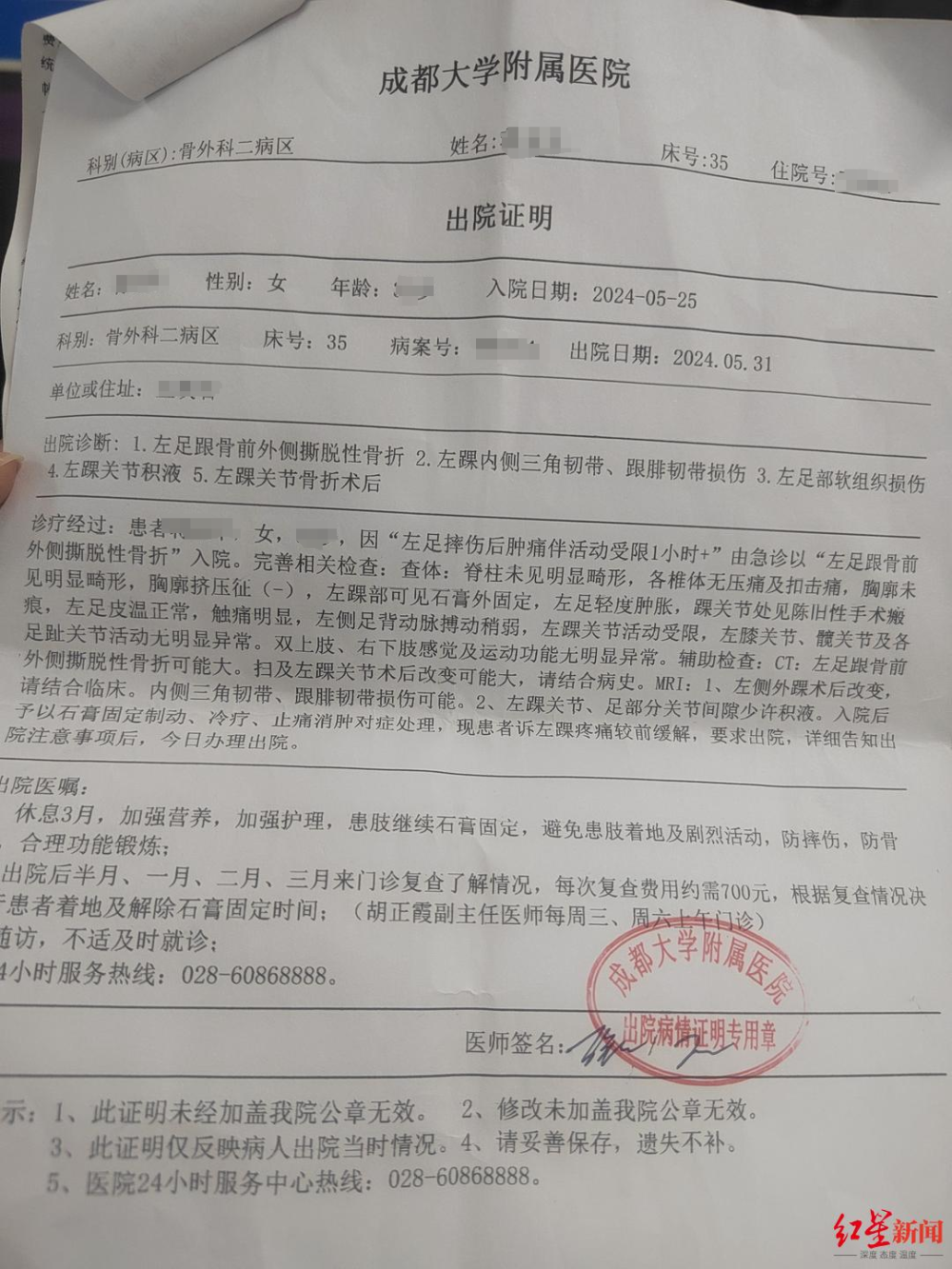 成都大学附属医院的出院证明记载,蒋女士左足跟骨前外侧撕脱性骨折、左踝内侧三角韧带、跟腓韧带损伤、左足部软组织损伤、左踝关节积液、左踝关节骨折术后。医嘱其休息3月,患肢需要继续用石膏固定,出院后定期复查。蒋女士自称,由于脚部受伤在家休养了3个月。
