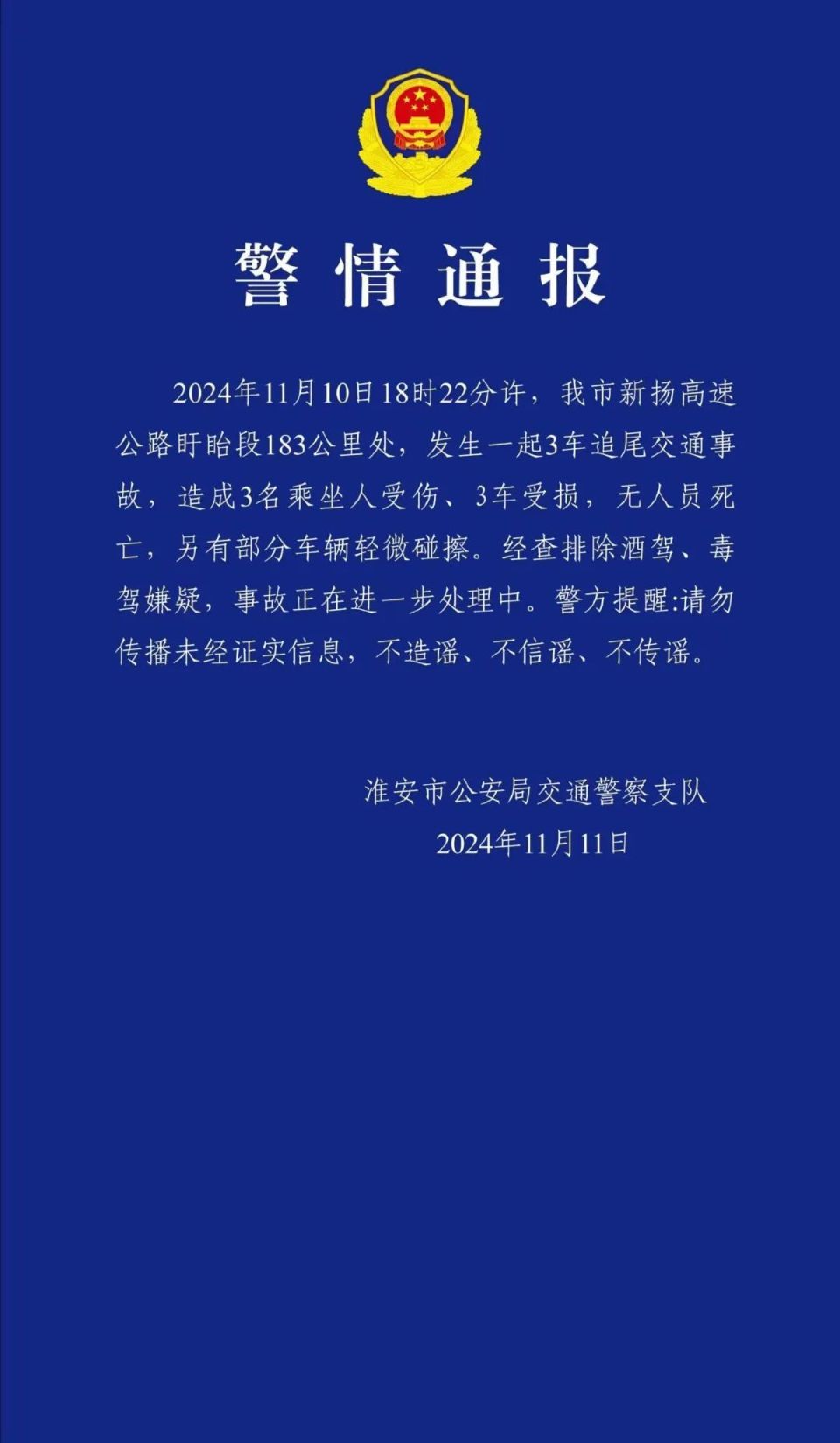 11月11日,淮安市公安局交通警察支队发布警情通报:3车追尾致3人受伤。