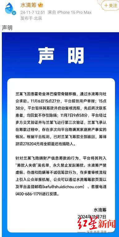声明中表示,根据平台规则,已对兰某飞筹款全部追回,筹得款项278204元将全额退换给捐助人。水滴筹方面同时表示,兰某飞将被列入“筹款人失信”黑名单,永久禁止发起筹款。