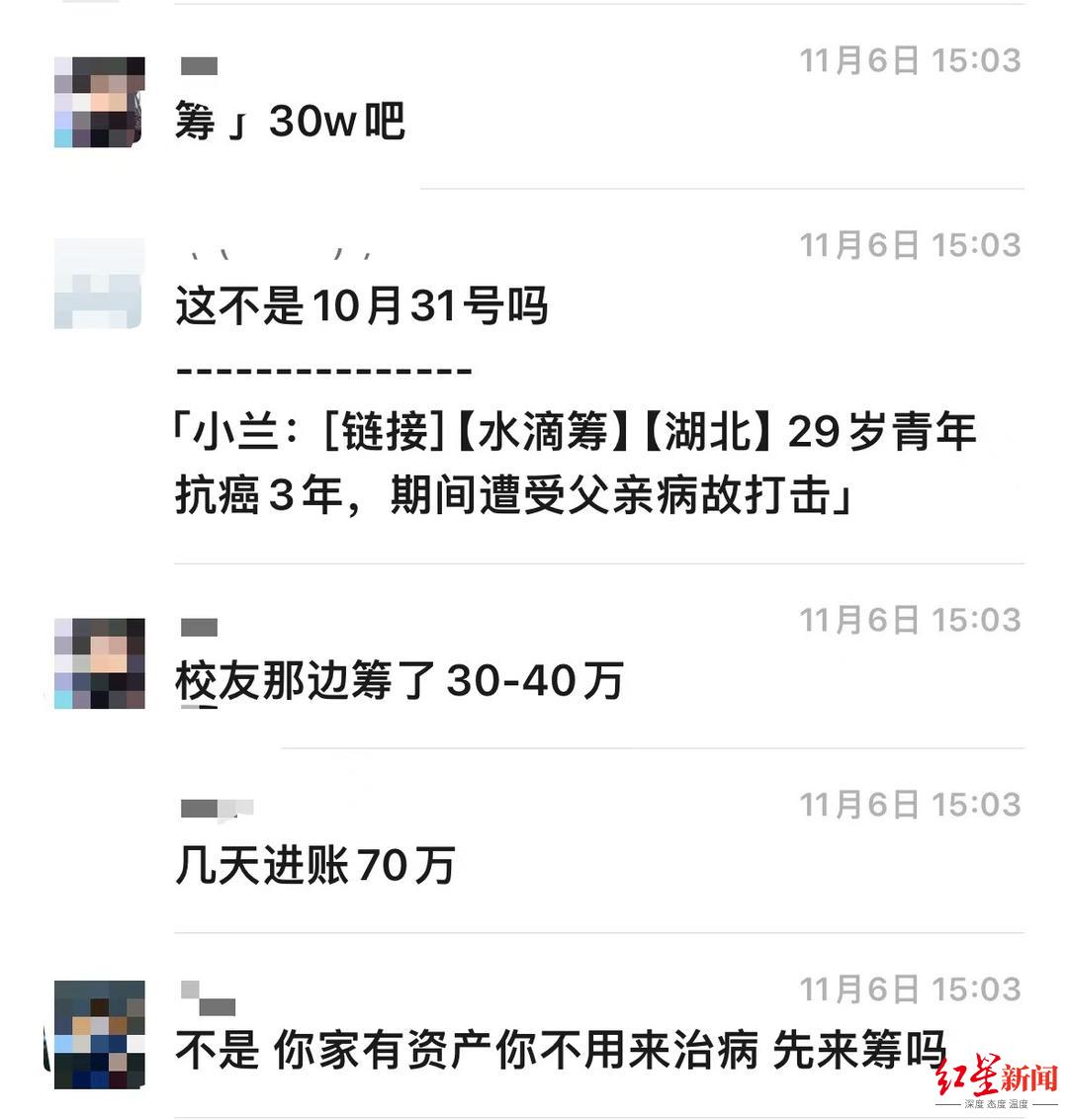 然而筹款通道开启不久,兰某飞就因11月6日在多个群里晒房产照,被多位群成员质疑隐瞒真实财产状况骗捐。红星新闻记者注意到,11月7日水滴筹平台已关闭兰某飞筹款通道,但此前他已在该平台累计获捐4536次,筹款金额达到27万余元。