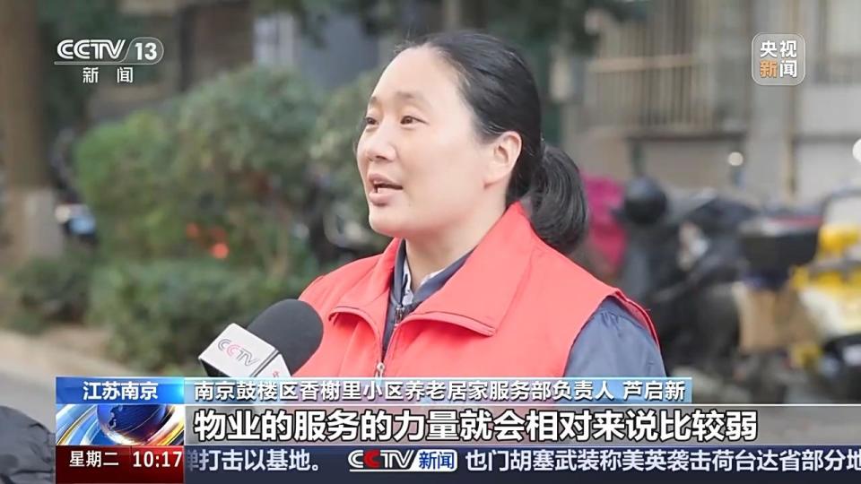 南京鼓楼区香榭里小区养老居家服务部负责人 芦启新:我们发现有些老旧小区,物业的服务的力量就会相对来说比较弱。我们养老服务企业有专业的服务团队熟悉服务领域的一些政策,可以把“物业+养老”的模式持续下去。