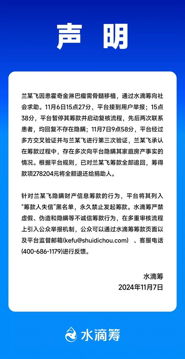 声明中表示,根据平台规则,已对兰某飞筹款全部追回,筹得款项278204元将全额退还给捐助人。水滴筹方面同时表示,兰某飞将被列入“筹款人失信”黑名单,永久禁止发起筹款。