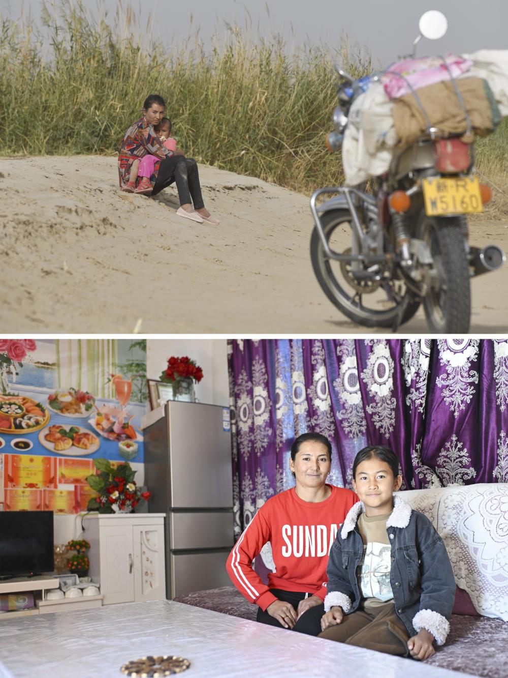 拼版照片:上图为搬迁前,一次外出归来,达里雅布依村村民比里刻自·如孜抱着女儿在路旁休息(2018年9月6日摄);下图为比里刻自(左)和女儿在新村家中休息(2024年11月9日摄)。新华社记者 胡虎虎 摄