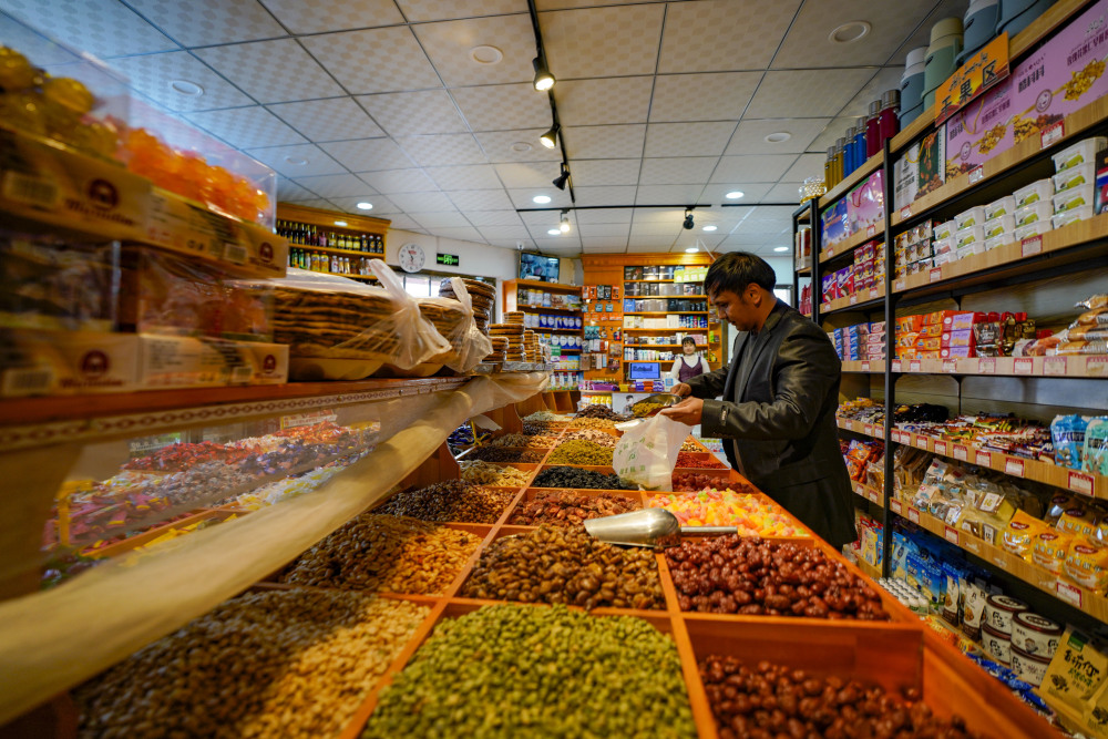 在新疆于田县城,达里雅布依村民吾不力卡司木·买吐送在超市内为顾客盛装干果(2024年11月11日摄)。2021年起,他在县城开了一家超市。新华社记者 陈朔 摄