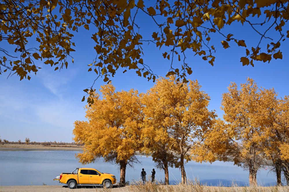 人们在新疆于田县达里雅布依旧址景区内克里雅河畔胡杨树下休息(2024年11月5日摄)。新华社记者 陈朔 摄