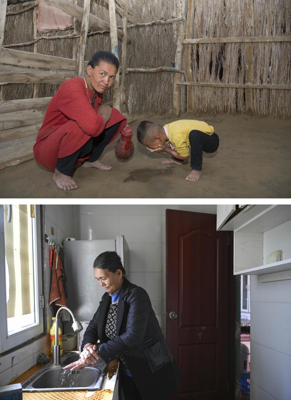 拼版照片:上图为搬迁前,达里雅布依村村民库尔班罕·麦麦提热依木给小孙子倒水洗脸(2018年9月6日摄);下图为库尔班罕在新村家中洗手(2024年11月7日摄)。新华社记者 胡虎虎 摄