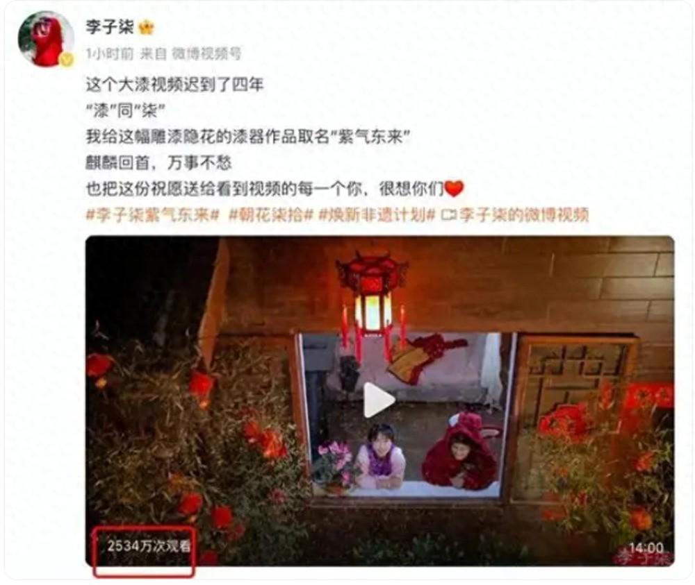李子柒在视频中表示:“这个大漆视频迟到了四年,‘漆’同‘柒’,我给这幅雕漆隐花的漆器作品取名‘紫气东来’,麒麟回首,万事不愁,也把这份祝愿送给看到视频的每一个你,很想你们。”