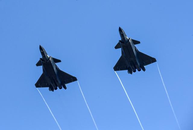 11月11日,空军八一飞行表演队在珠海进行适应性飞行训练,以独特的方式庆祝中国人民解放军空军成立75周年。新华社发(杨博 摄) 如雷震耳,轰鸣声中,重型舰载战斗机歼-15T稳稳落地珠海,这是人民海军战机首次出现在中国航展;