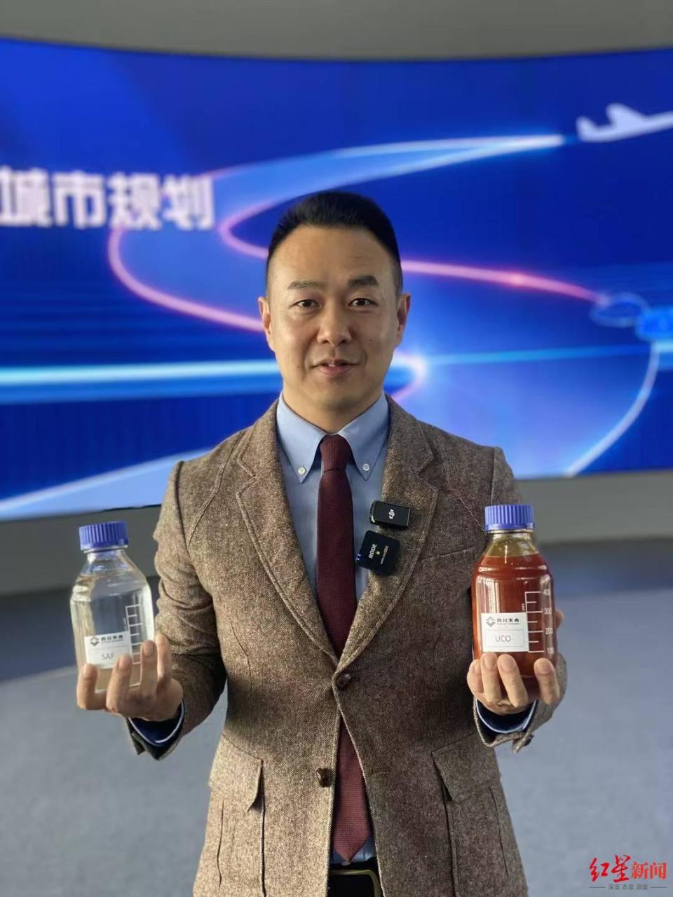 “我们在中试实验中,能达到70%的转化率。”在航展现场唯一的双流+双流机场“政企CP”展区,四川天舟国际贸易有限公司总经理陈宇手中拿了两个玻璃瓶,一个瓶子里装着黏黏糊糊的红棕色地沟油,另一个瓶子装着透明洁净的航油。