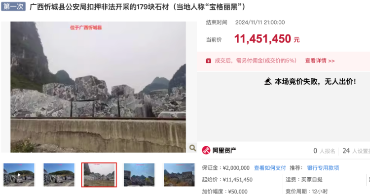 11月12日,广西忻城县一批被扣押的非法开采石材(当地人称“宝格丽黑”)在阿里拍卖平台上进行司法拍卖。此次拍卖的石材共有179块,起拍价为1145万元,单块平均重量约30吨。这批石材起拍价之高引发了网友关注。尽管拍卖页面显示有1200多人围观,但当晚21点拍卖结束时无人出价,拍卖最终流拍。