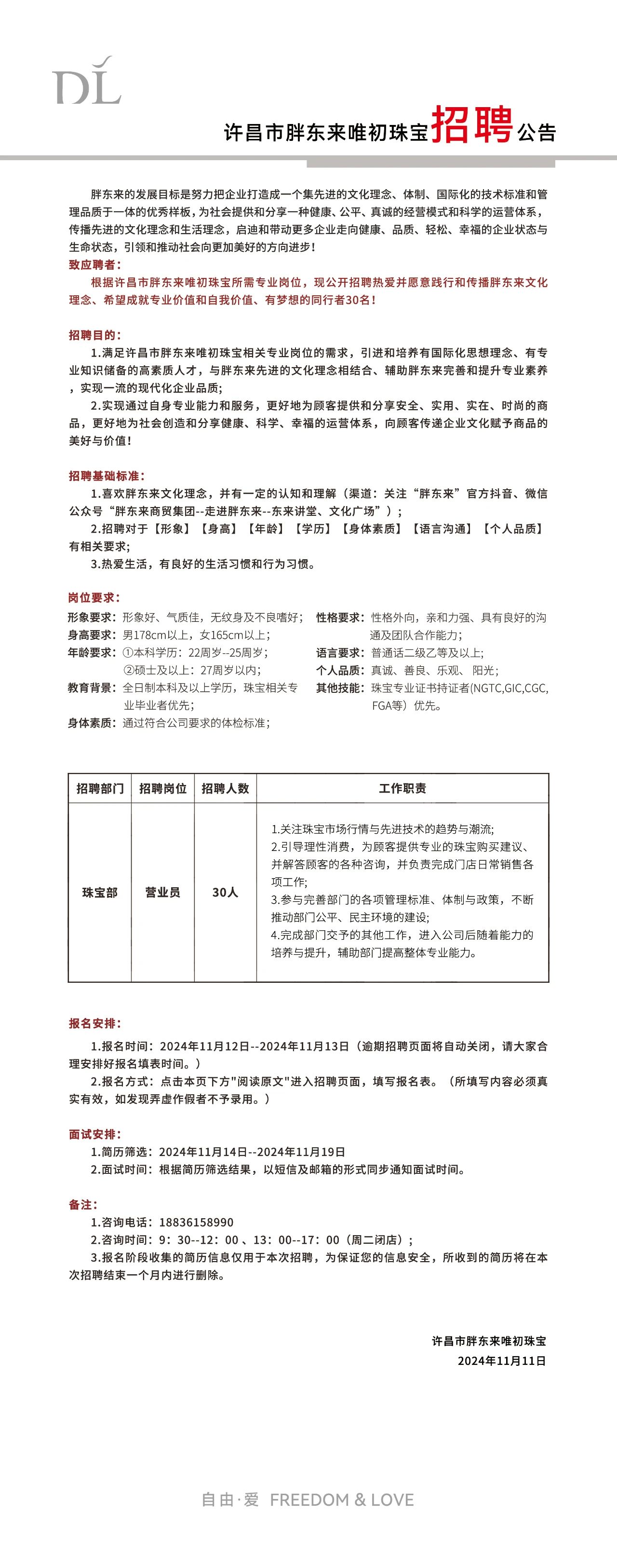 11月11日,胖东来超市官方微信公众号发布招聘公告,此次拟招聘人员共计30人,主要是为胖东来唯初珠宝板块进行招聘,对于形象、身高、年龄、学历等有一定要求。