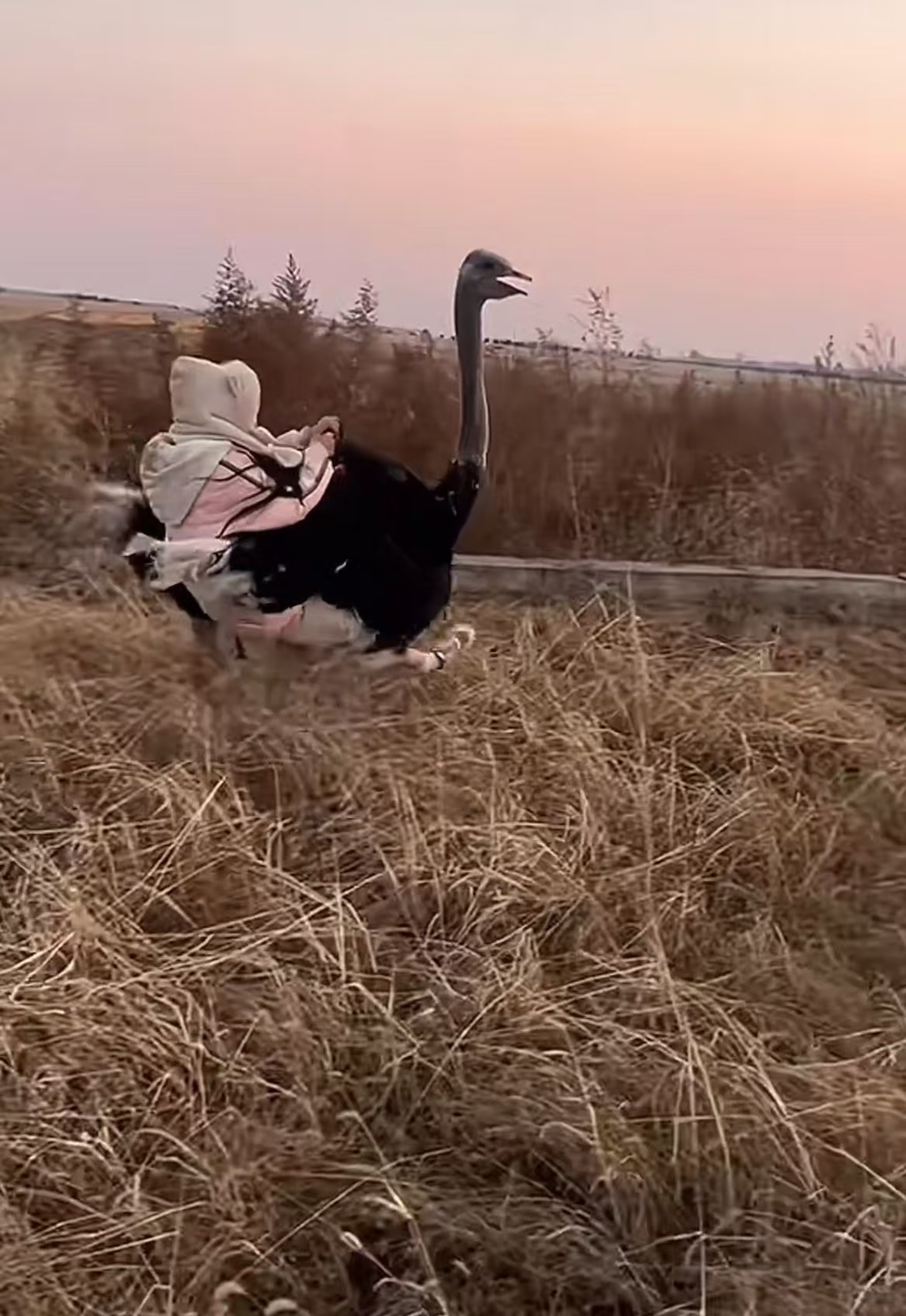 近日四川的郑女士来到哈尔滨体验骑鸵鸟项目,视频中鸵鸟载着郑女士跑得飞快,郑女士因捂不住鸵鸟的眼睛,刹不住车导致摔倒,由于鸵鸟跑得太快,工作人员只能在后面拼命追赶,场面非常滑稽。