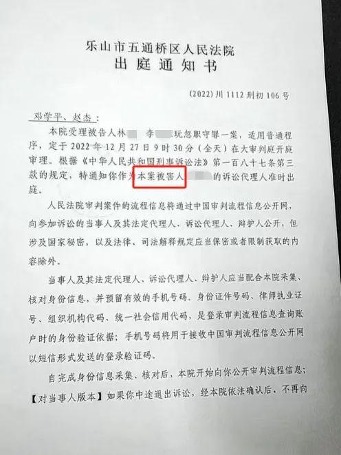 善某某女儿善晓云(化名)介绍,该案原本于2022年12月27日在乐山市五通桥区人民法院开庭审理,后因故取消。当时他们是拟以受害者家属身份,并委托了律师,但这一次法院通知称,他们不能够以受害者家属身份参与诉讼,只能旁听此案。
