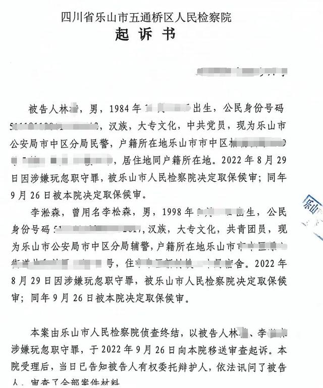 起诉书显示,2022年4月3日15时许,被告人林某(时任乐山市公安局市中区分局张公桥派出所副所长)带领被告人李某某(辅警)押解涉嫌强制猥亵罪的犯罪嫌疑人善某某(应采访对象要求,采用化姓),到位于乐山市某高中校区辨认现场,执法过程中二人违反政法委和公安机关办案规定,严重不负责任,不正确履行自己的职责。特别是善某某将二人带到某教学楼四楼后,林、李先后离开善某某身边,同时背对善某某,看向右侧墙面长达15秒,让站在某教室(门窗呈开启状态)门口的善某某一直处于无人看管、失控状态,致使善某某有可乘之机,其左手从手铐中脱出并冲入教室,翻出窗外,坠楼死亡。