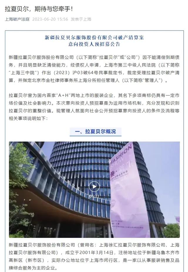 2023年6月20日,“上海破产法庭”微信公众号发布了一则公告:拉夏贝尔服饰股份有限公司正式破产清算。