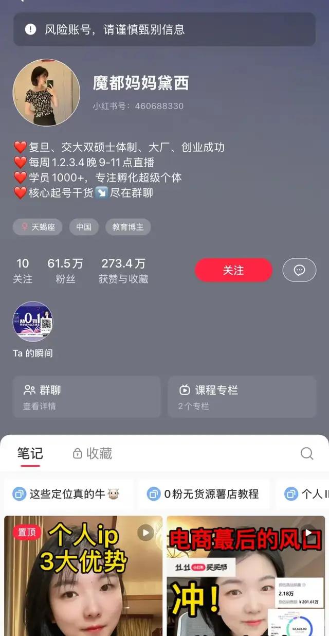 小观查询发现,“魔都妈妈黛西”账号目前有61.5万粉丝,简介介绍其为复旦交大双硕士,有体制、大厂、创业成功经历,学员1000+。目前该账号已被标注为风险账号,其最后更新停留在2023年10月10日。