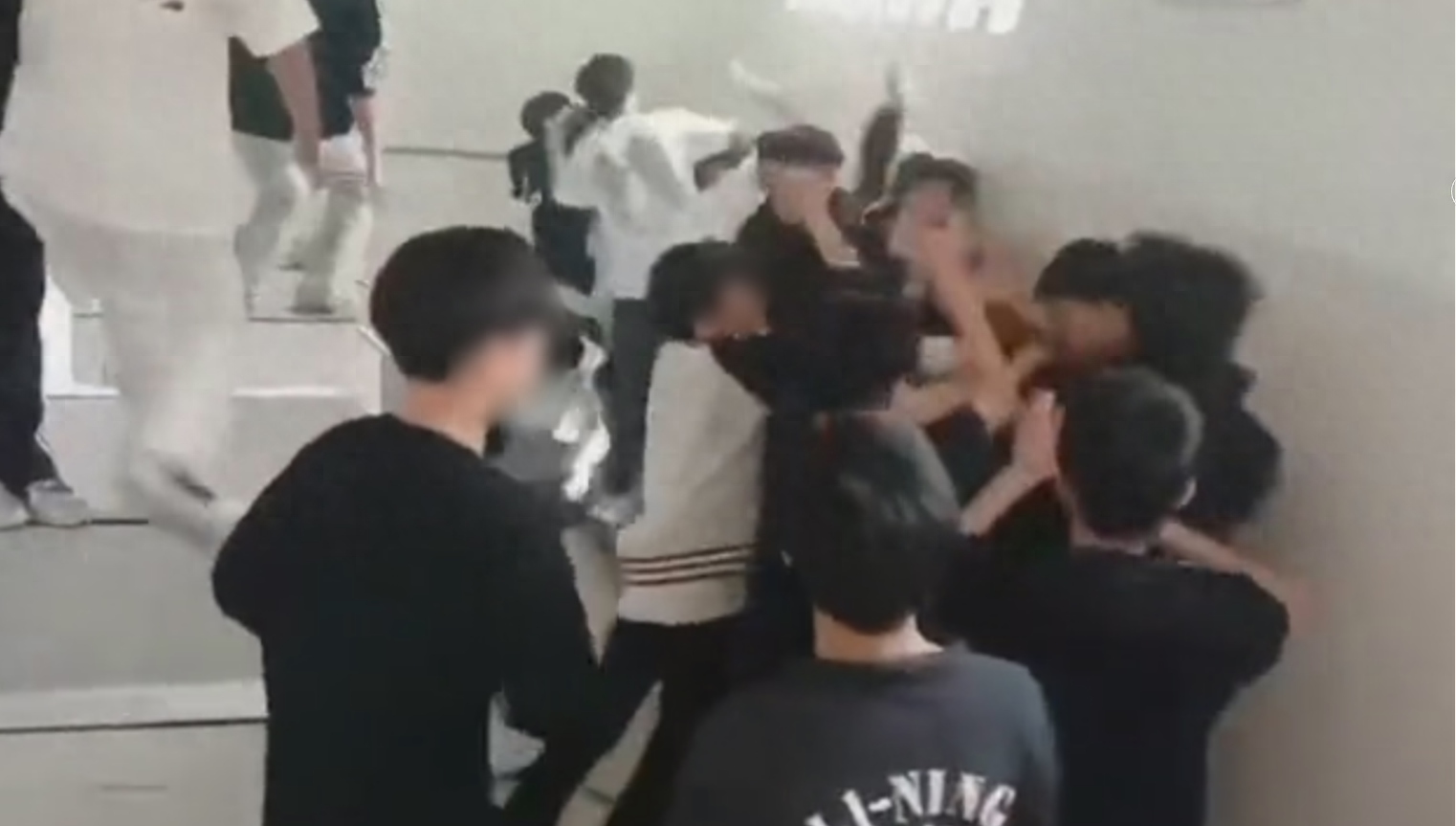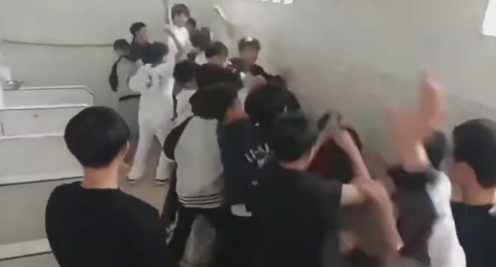 视频显示,在一公厕中,一群男生将两三名男生围堵在内,众人“七嘴八舌”。期间,有人大喊“砸”,随即多人附和,一群人冲上前去,挥拳疑对3名男生围殴。