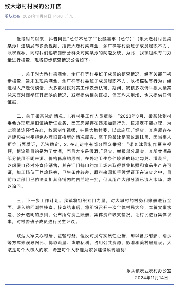 央视网消息:据乐从发布微信公众号消息,11月14日,广东佛山市顺德区乐从镇农业农村办公室发布《致大墩村村民的公开信》称,近段时间以来,抖音网民“怂仔不怂了”“悦酿喜事(怂仔)”(系大墩村村民梁某泳)连续发布多条视频,指责大墩村梁满全、余广祥等村委班子成员履职不力、以权谋私,同时我们也收到部分群众对梁某泳的问题反映。经有关部门初步核查,暂未发现梁满全、余广祥等村委班子成员履职不力、以权谋私等行为;经进村入户走访谈话,大多数村民对其工作表示认可。期间,该镇多次请举报人梁某泳来面对面举证其反映的情况,或者提供相关证据,但其均未到场,也未提供任何证据。