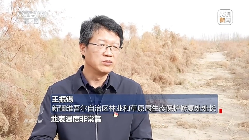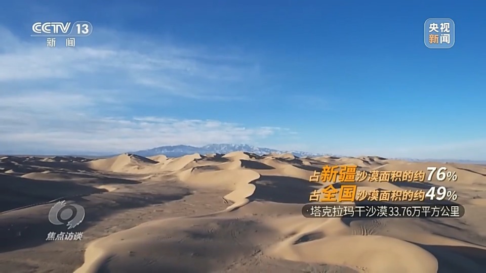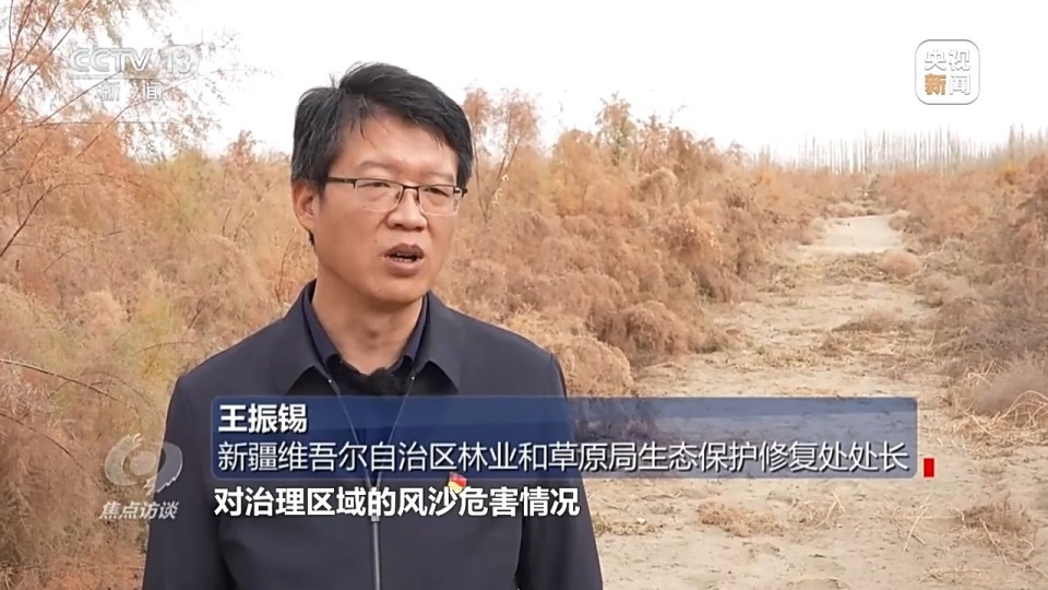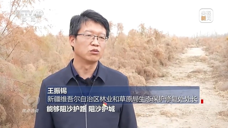 新疆维吾尔自治区林业和草原局生态保护修复处处长 王振锡:开展塔克拉玛干沙漠边缘“锁边”工程能够阻沙护路、阻沙护城,这是经济社会发展非常有力的坚实保障。