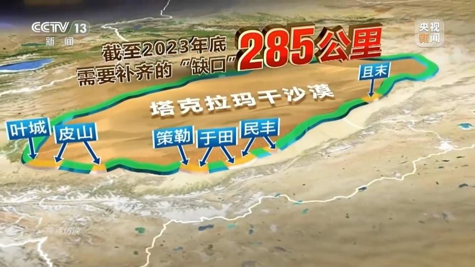 环绕塔克拉玛干沙漠边缘一圈的长度是3046公里。虽然经过40多年的治理,塔克拉玛干沙漠周边已形成了长达2761公里的绿色阻沙防护带,但截至2023年底仍有285公里的缺口,主要分布在沙漠南缘沿线的叶城、皮山、策勒、于田、民丰、且末等县域。目前,这285公里缺口已经完成了86%,仅剩最后的40公里。