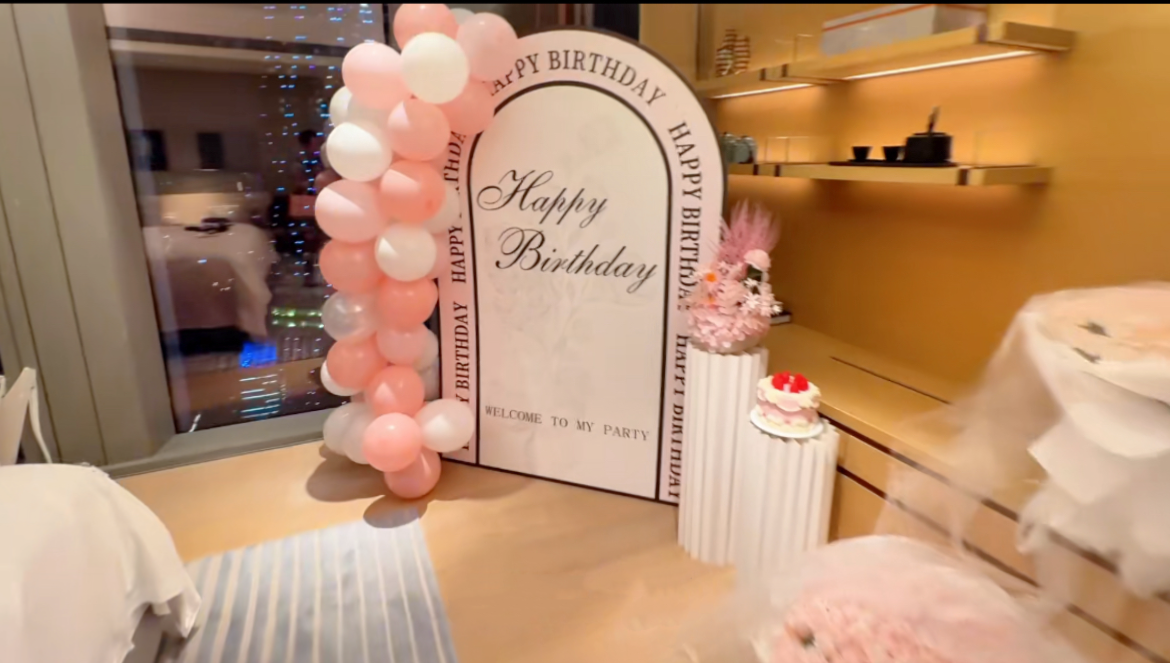 晚上的酒店套房,玻璃窗外灯光璀璨。屋内同样光鲜亮丽,地上摆着“Happy Birthday”的白粉色KT板,桌上放着两束199朵的永生花,还有一个草莓蛋糕模具。就这样,Bonnie在这里拍完了她的“生日照”。值得一提的是,Bonnie是当天在这里“过生日”的第八个女孩。