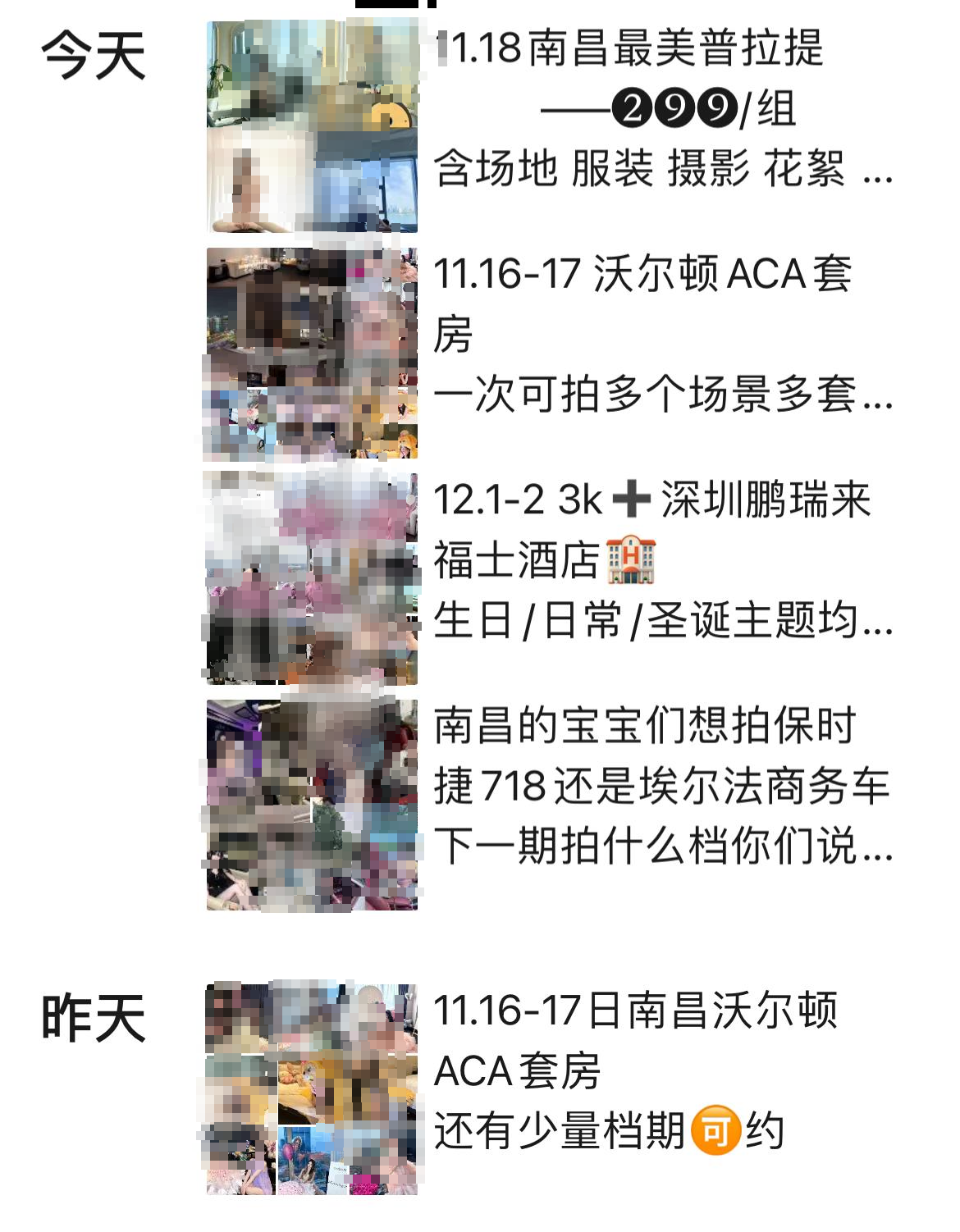 潮新闻联系的另一家拍摄机构,价格也相近。工作人员表示可以提供酒店、下午茶、豪车等多种场景拍摄,价格为498元/半小时,898元/一小时,若需要妆造,则需要额外再加235元。
