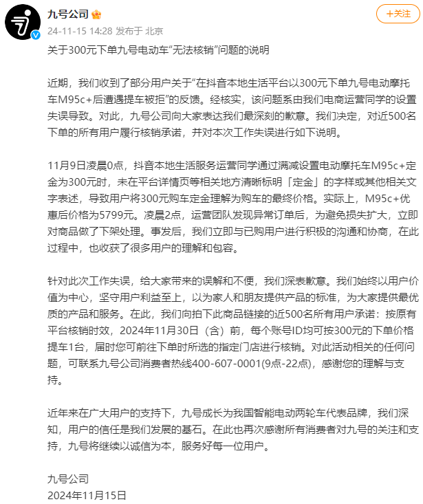 针对此次工作失误,给大家带来的误解和不便,我们深表歉意。我们始终以用户价值为中心,坚守用户利益至上,以为家人和朋友提供产品的标准,为大家提供最优质的产品和服务。在此,我们向拍下此商品链接的近500名所有用户承诺:按原有平台核销时效,2024年11月30日(含)前,每个账号ID均可按300元的下单价格提车1台,届时您可前往下单时所选的指定门店进行核销。对此活动相关的任何问题,可联系九号公司消费者热线400-607-0001(9点-22点),感谢您的理解与支持。