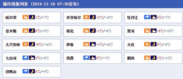 城市中,明天哈尔滨最高气温将降至零下4℃,是当地今冬首次全天处于冰点以下,寒冷感十足,小伙伴们外出需羽绒服、帽子、手套等厚衣物护体,谨防感冒、心脑血管等方面疾病的发生。