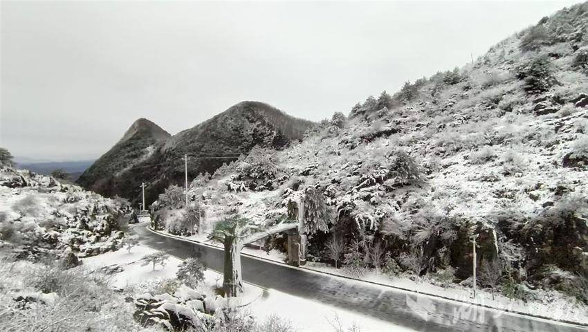 坎子山村村民介绍,低海拔路段积雪不多,山顶上积雪厚达到10厘米左右。为保障道路安全,已安排道路劝导员对来往车辆进行提示疏导。