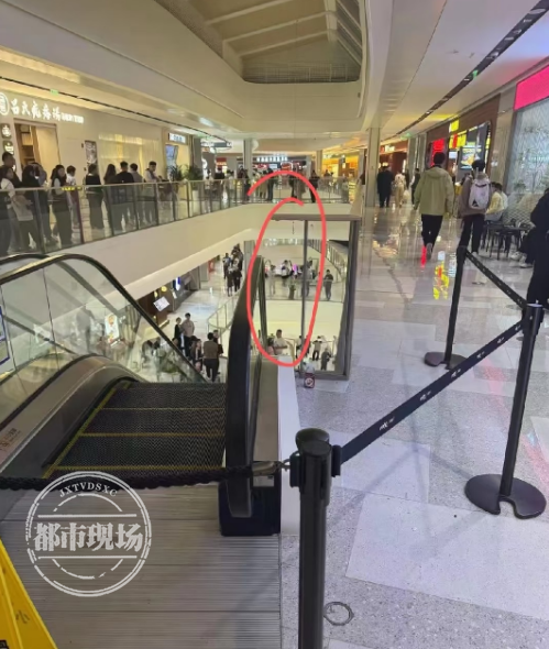 现场画面显示,女孩坠落在商场中庭,身旁有大量碎玻璃和血迹。四楼扶梯旁,也有玻璃破碎脱落。