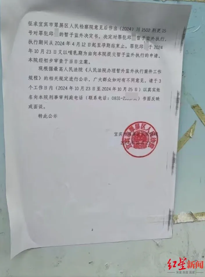 近日,一则落款为宜宾市翠屏区人民法院的“公示”引发关注。该公示显示,因犯运输毒品罪被判处十五年有期徒刑的邱某在被监视居住及判刑后,四年时间三次怀孕生育小孩,经申请被法院决定暂予监外执行。