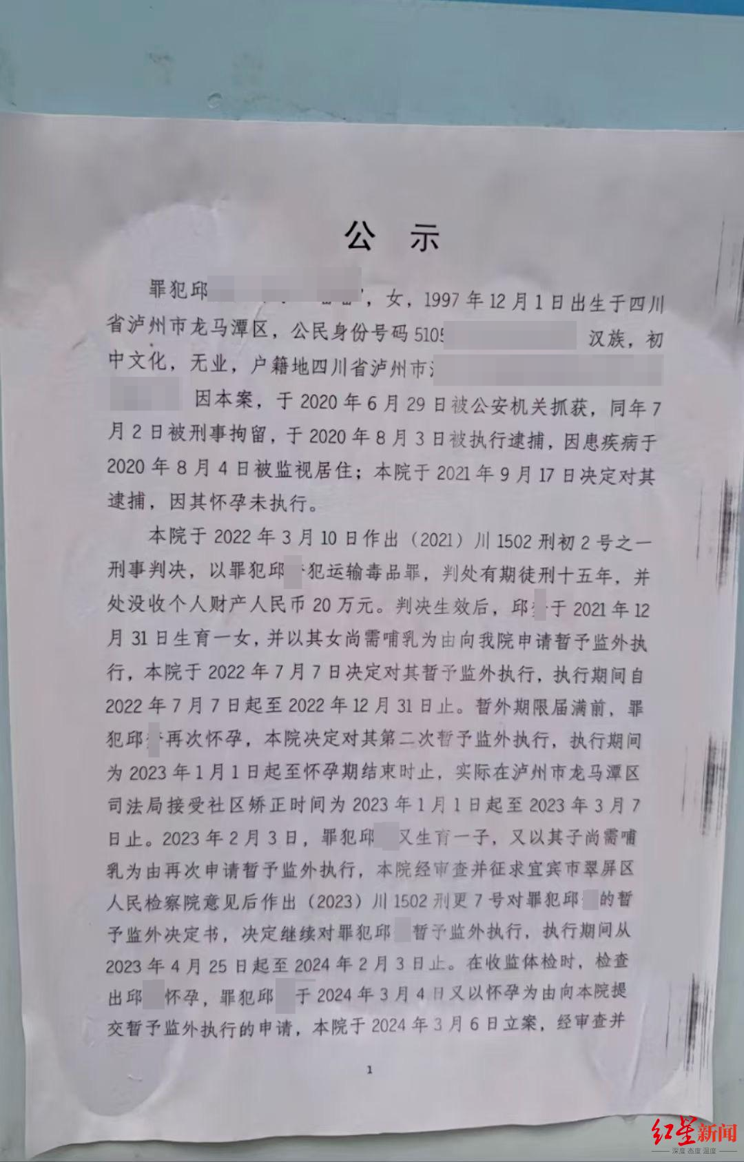 落款时间为2024年10月23日的“公示”显示:罪犯邱某,女,1997年12月1日出生于四川省泸州市龙马潭区,汉族,初中文化,无业,户籍地四川省泸州市江阳区某小区。邱某因运输毒品于2020年6月29日被公安机关抓获,同年7月2日被刑事拘留。2020年8月3日,邱某被执行逮捕,因患疾病于8月4日被监视居住。2021年9月17日,宜宾市翠屏区人民法院决定对邱某实施逮捕,但因其怀孕未执行。