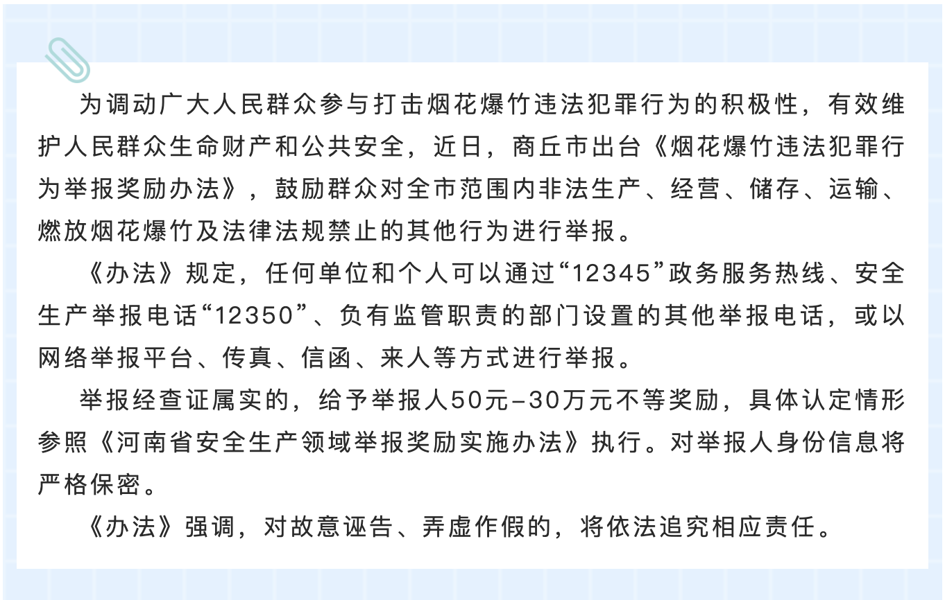 为调动广大人民群众参与打击烟花爆竹违法犯罪行为的积极性,有效维护人民群众生命财产和公共安全,近日,商丘市出台《烟花爆竹违法犯罪行为举报奖励办法》,鼓励群众对全市范围内非法生产、经营、储存、运输、燃放烟花爆竹及法律法规禁止的其他行为进行举报。