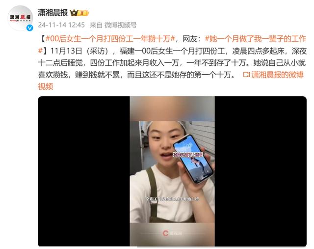 近日,“00后女生打4份工一年攒10万”引起广泛关注。