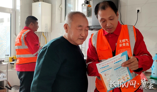 “大爷,在家吗?我们来检查一下燃气。”随着门外响起一阵敲门声,霸州市胜利顺达燃气有限公司的天然气安全员来到梁章民宽敞明亮的新家中,他们一边检查燃气设施,一边向梁章民讲解安全用气知识,发放“安全用气十不准”宣传单。