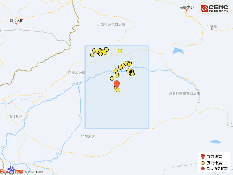 历史地震:根据中国地震台网速报目录,震中周边200公里内近5年来发生3级以上地震共452次,最大地震是2023年1月30日在新疆阿克苏地区沙雅县发生的6.1级地震(距离本次震中80公里),按震级大小前50次历史地震分布如图。
