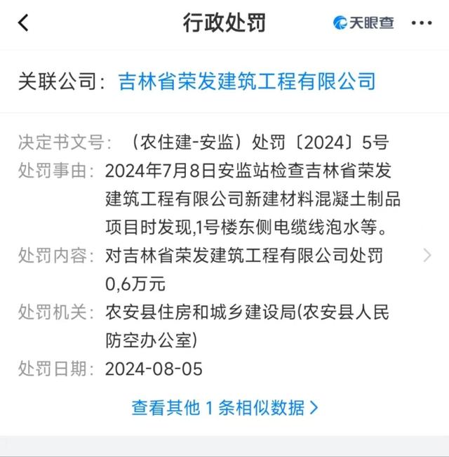 据天眼查,今年7月,安监站检查吉林省荣发建筑工程有限公司新建材料混凝土制品项目时发现,1号楼东侧电缆线泡水等。8月,依据《中华人民共和国安全生产法》,对吉林省荣发建筑工程有限公司处0.6万元罚款。