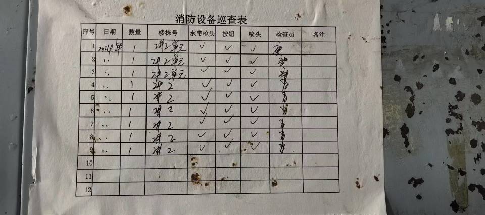 业主胡先生指着消火栓上贴着的“消防设备巡查表”称,“你看他们巡查后在‘水带枪头’‘按钮’‘喷头’处都打了勾,而且按理是每个月检查一次,看这个字迹,应该是4月到9月一次性写的,弄虚作假。”