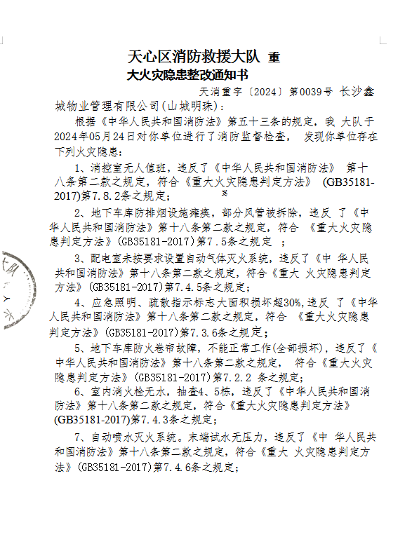 在天心区消防救援大队于6月4日向鑫城物业下达了重大火灾隐患整改通知书后,夏经理表示,“已经在整改中,到2025年5月会整改好。”
