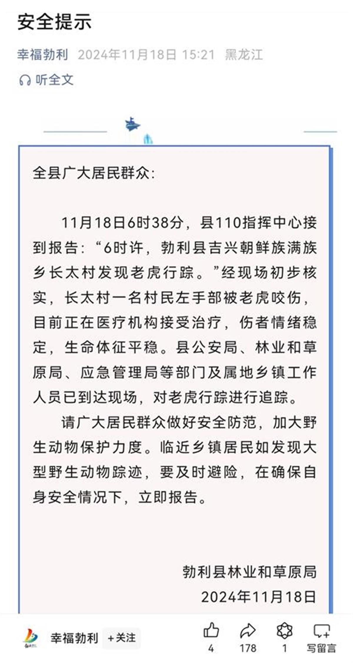 11月18日,黑龙江七台河市勃利县长太村发生老虎伤人事件。当日,南都记者从黑龙江省林业和草原局获悉,黑龙江省林草局召开东北虎保护工作紧急会议,进一步强化东北虎保护相关工作,加强冲突防范,确保人虎安全。会议指出,勃利县作为东北虎种群非重点分布区,此次出现东北虎进入村屯伤人事件,需要引起格外重视并加强风险防范。