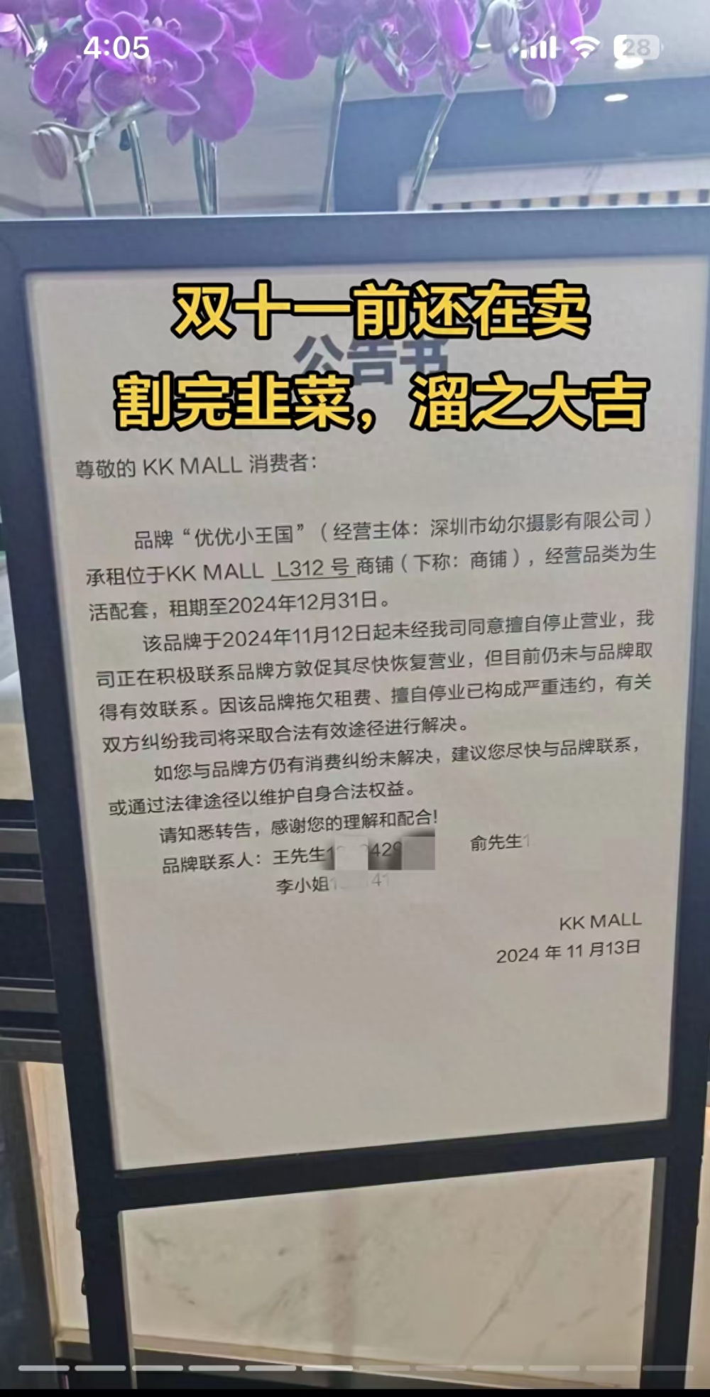 11月18日上午,华商报大风新闻记者联系到了深圳市罗湖区KKMALL商场,工作人员称,幼尔摄影门店与商场合约签至今年12月底,但11月中旬便停业,门店负责人的电话也无法拨通,最近有很多办过卡的消费者来商场维权,商场只能先登记下大家的联系方式,后续有进展再联系他们。