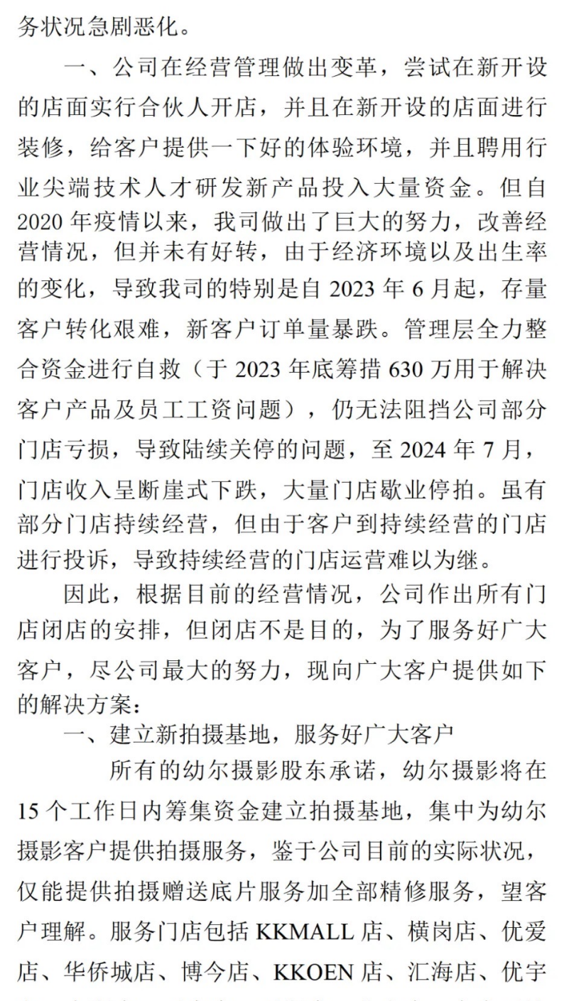 11月18日,“深圳优优小王国儿童摄影”公众号发布《声明》, 2020年3月以来,深圳市优优小王国摄影有限公司陷入经营困难,遂将未完成摄影业务转交给幼尔摄影有限公司,订单合计5千余万元。今年,幼尔摄影有限公司财务状况急剧恶化,多家门店难以为继,相继关店,公司目前已无资金可以用于退款。