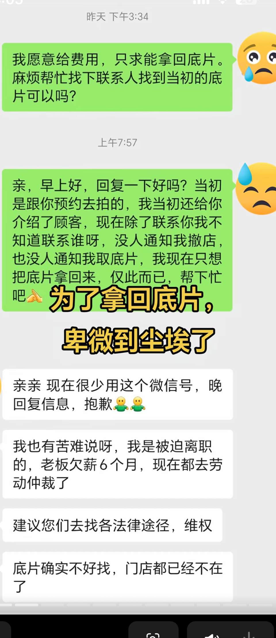 11月16日,该网友再次发声称,自己联系到了某门店的工作人员,表示希望取相片底片,门店工作人员称自己“有苦难言”,“我是被迫离职的,门店拖欠6个月工资未付,我已经申请劳动仲裁了。”“相片底片很难找回了,因为门店都已经倒闭了,建议通过法律维权。”