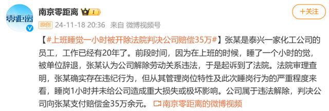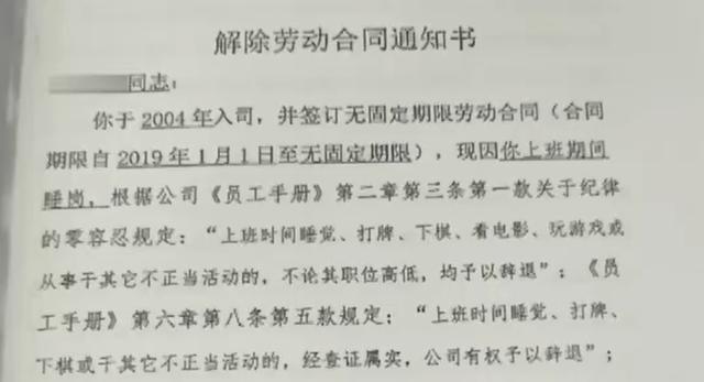 张某是江苏泰兴一家化工公司的员工,工作已有20年。今年,因为在上班时,睡了一个小时的觉被辞退,张某将公司起诉到了法院。
