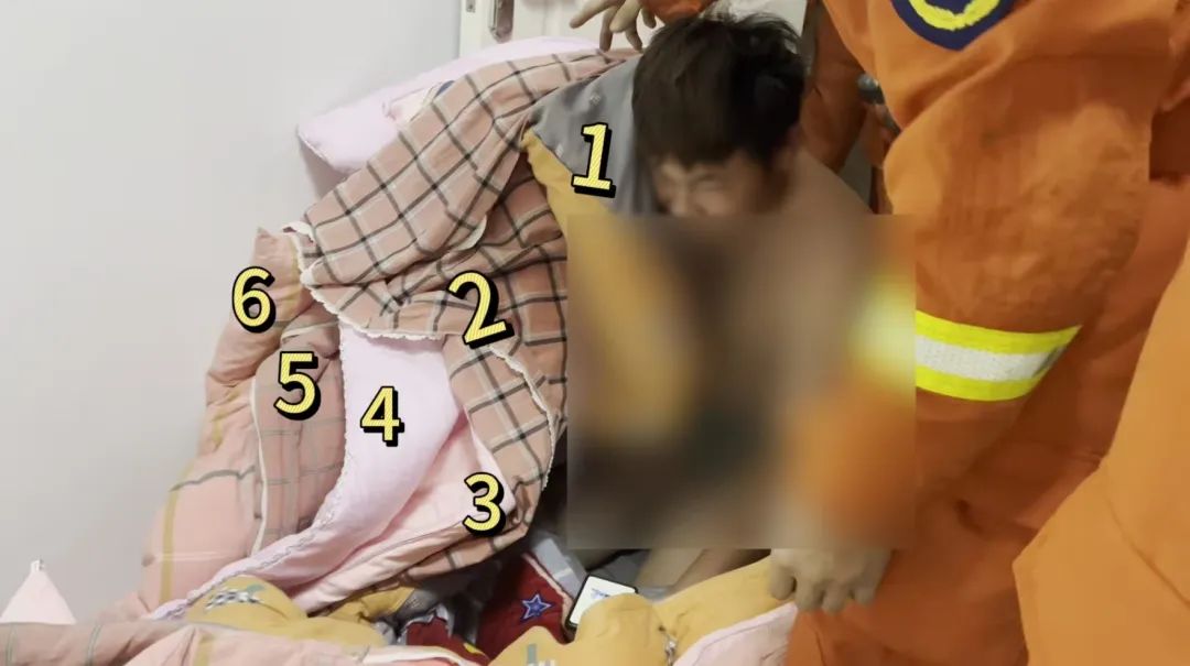 随后消防员了解到,该男子在家午睡时盖了6层被子,翻身时跌落下床不慎被卡,由于家中无人,被卡男子在尝试自行脱困未果后,遂拨打报警电话求助。
