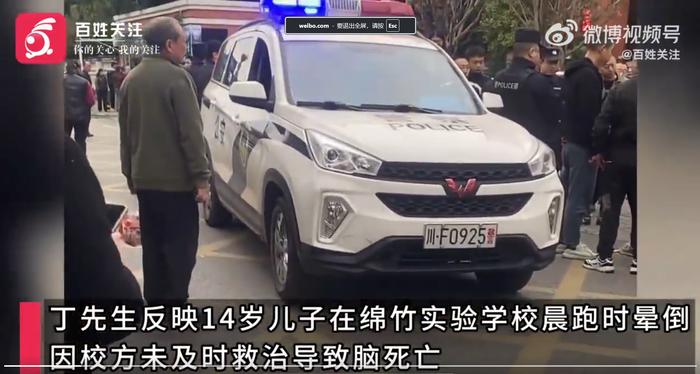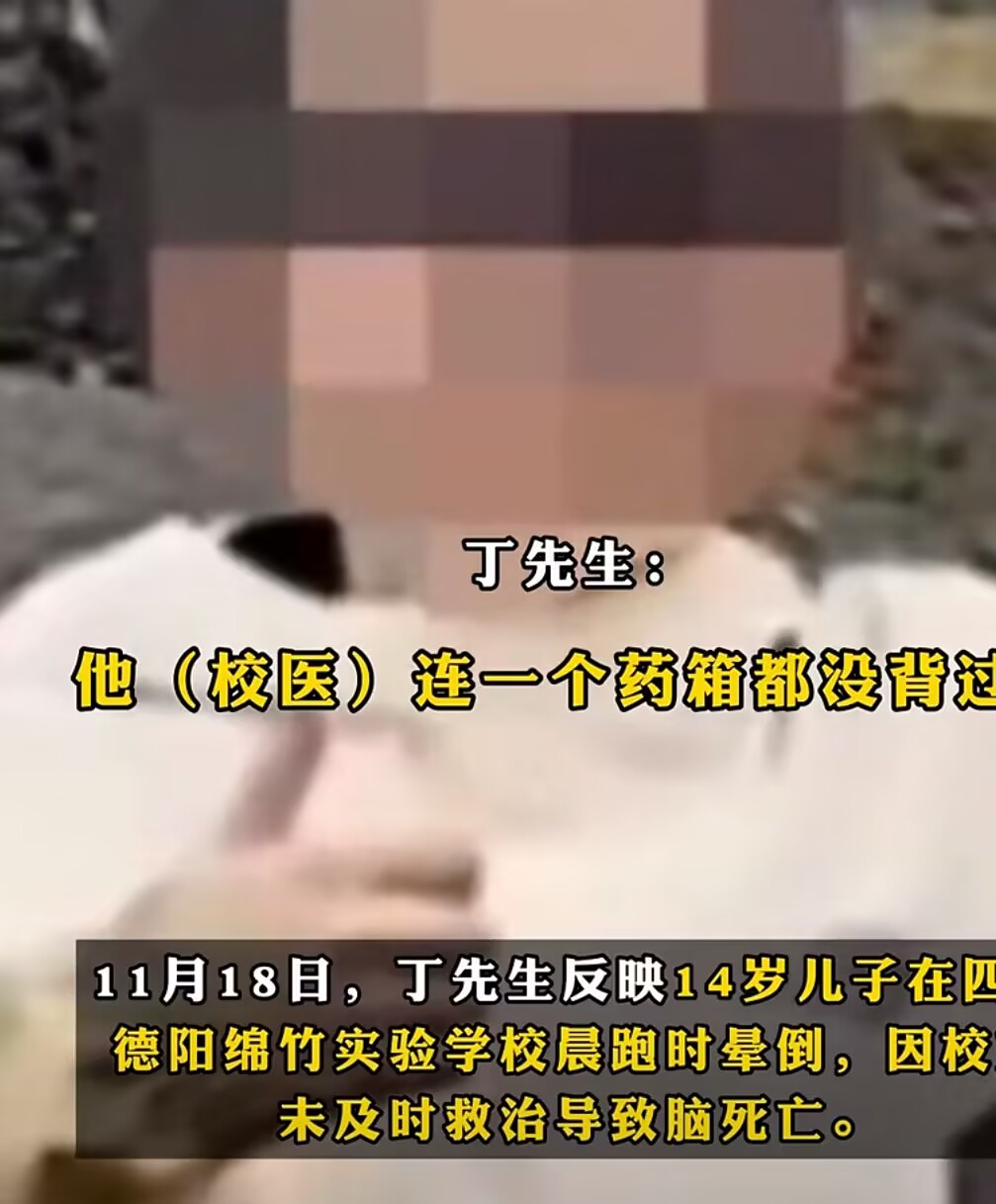 11月18日,丁先生反映14岁儿子在四川德阳绵竹实验学校晨跑时晕倒,因校方未及时救治导致脑死亡。