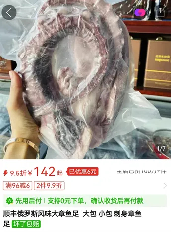一家电商平台上的“绥芬河宇洋俄罗斯精品商城”,店内一款“俄罗斯风味大章鱼足大包小包刺身章鱼足”,售价为142元/1000克,经专家鉴定为鱿鱼足;