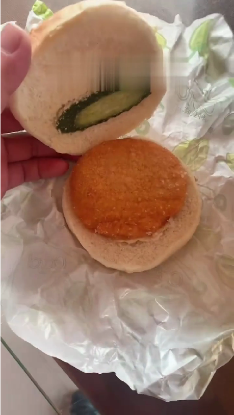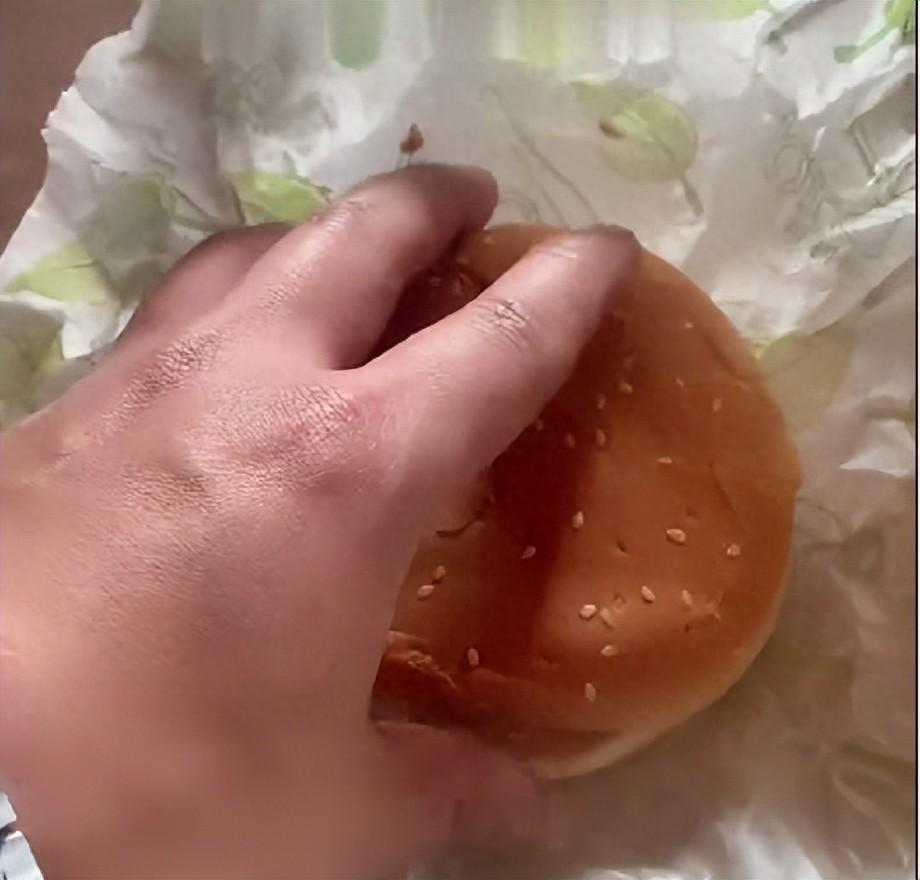 网友的视频配文显示,“学校配餐太狠了。”视频中,一个拳头大小的汉堡,中间仅夹了块鸡柳排和一片黄瓜。